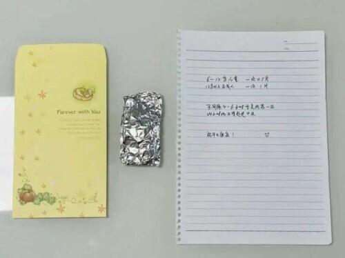 用锡纸分装的退烧药和手写的使用说明。唐晓芸供图