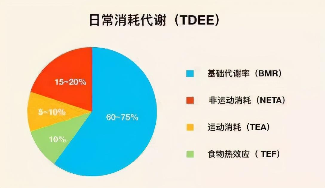 可不要小看基础代谢,我们每天的热量消耗,分为四部分:基础代谢、运动消耗、非运动消耗和食物热应。其中,基础代谢消耗占到了60%以上,可见其重要性。