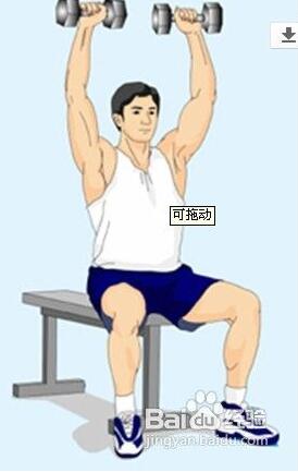 过程:推起哑铃搞过于头顶。保持手臂稍微的弯曲。然后返回。