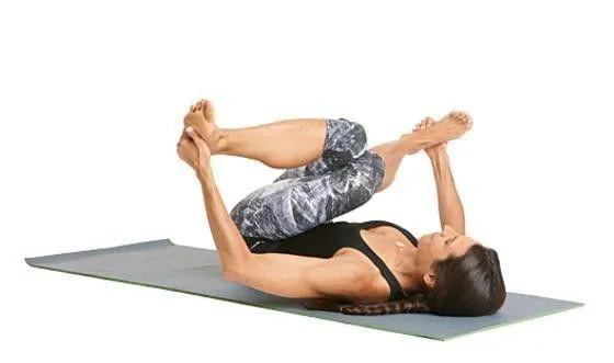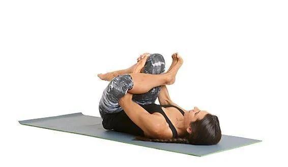 仰卧,膝盖交叠,左手抓右脚外侧,右手抓右脚外侧膝盖靠近胸腔,保持10次呼吸,换边7.仰卧扭转