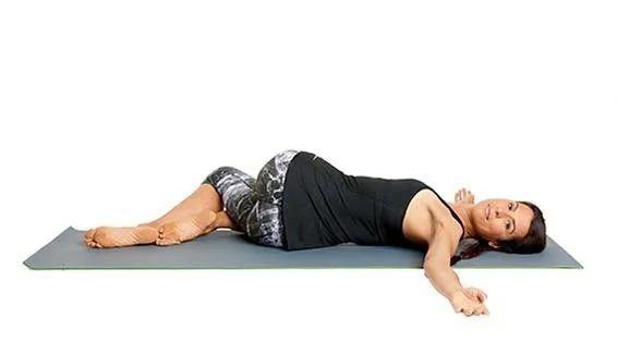 仰卧,左腿缠绕右腿,双手打开膝盖向右侧着地,转头看左侧保持1分钟,换边8.倒箭式