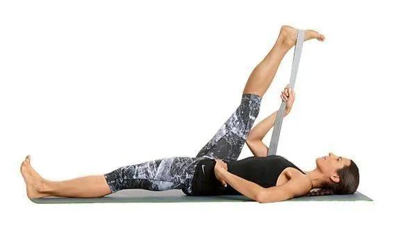 仰卧,右手用瑜伽带,套在右脚上拉右腿靠近胸腔,保持腿伸直保持1分钟,换边5.仰卧穿针式
