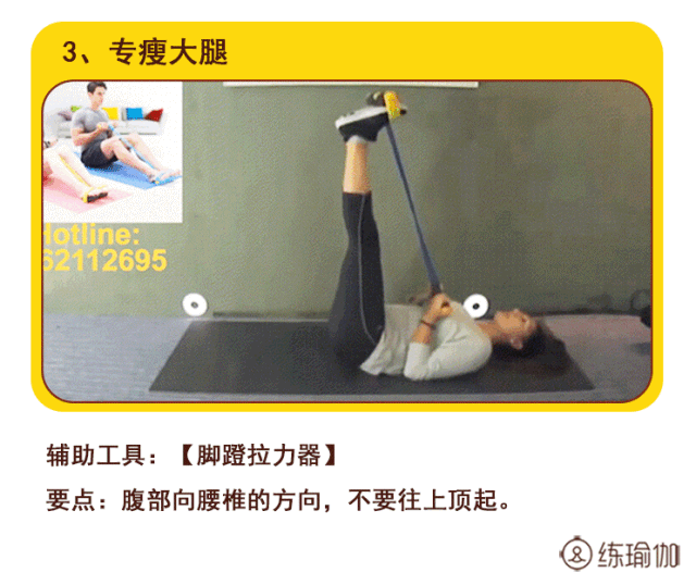 第三种动作做法:绳套套在前脚掌上,仰卧,手拉拉力器,带动腿部向天花板的方向垂直之后,向下,重复做20组。(采用鼻子吸气,嘴巴呼气)