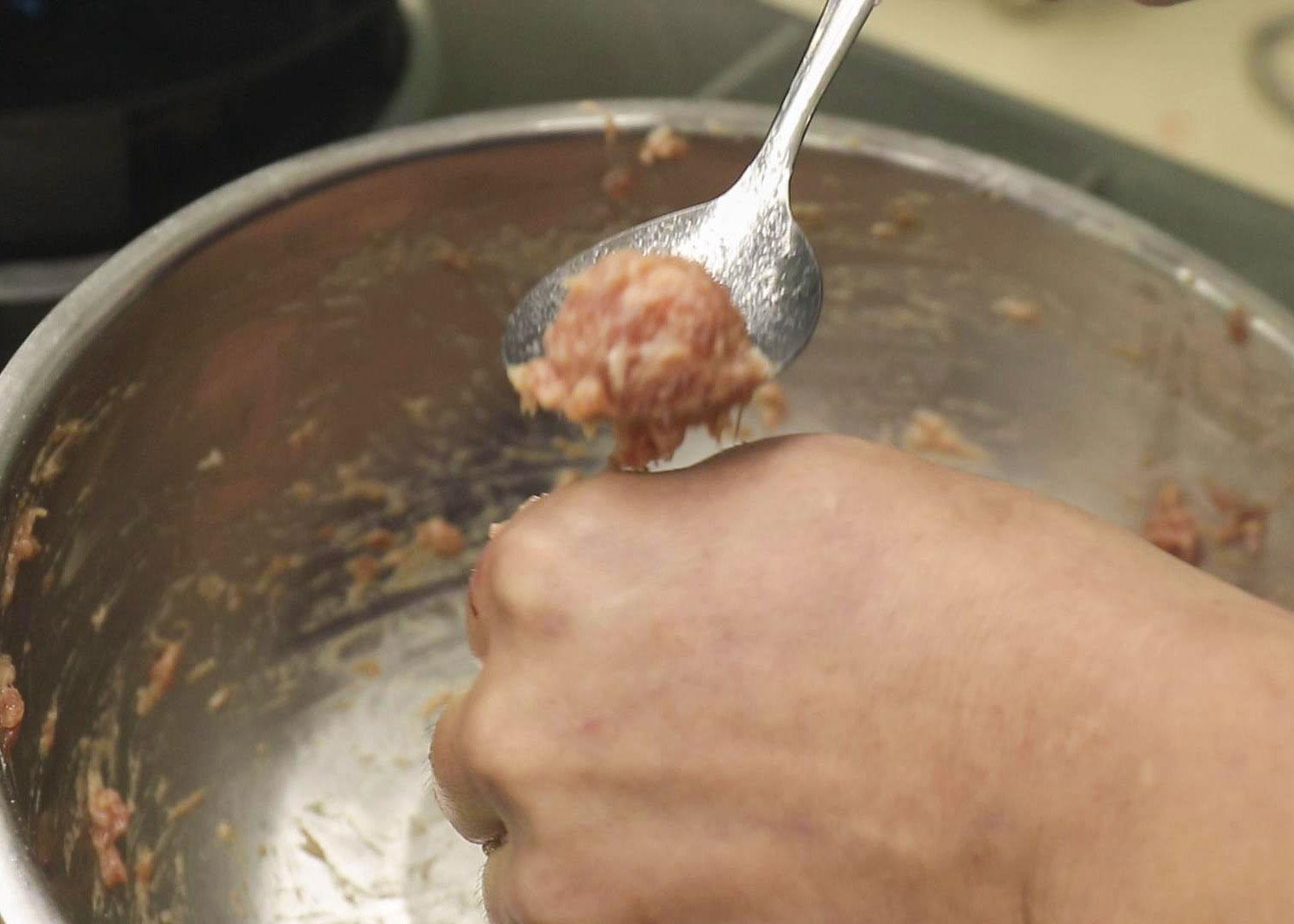 顺着一个方向分三次把葱姜水全打进肉馅。肉馅吸饱水分以后口感更加的滑嫩有弹性。抓入一小把淀粉继续搅匀 ,锁住水分。一直把肉馅打至上劲成团就行了。