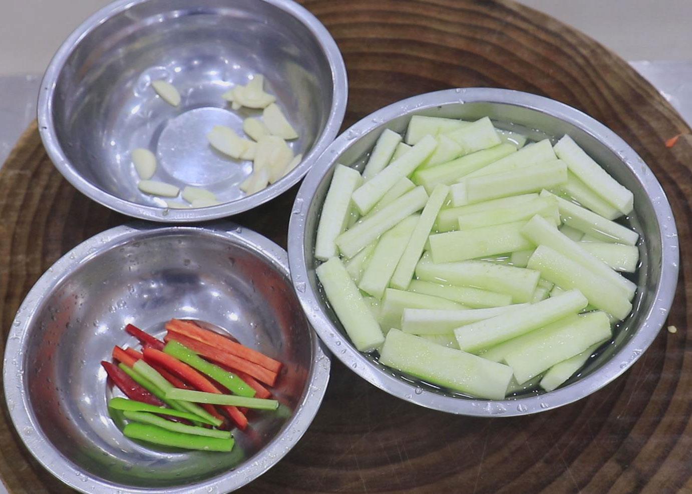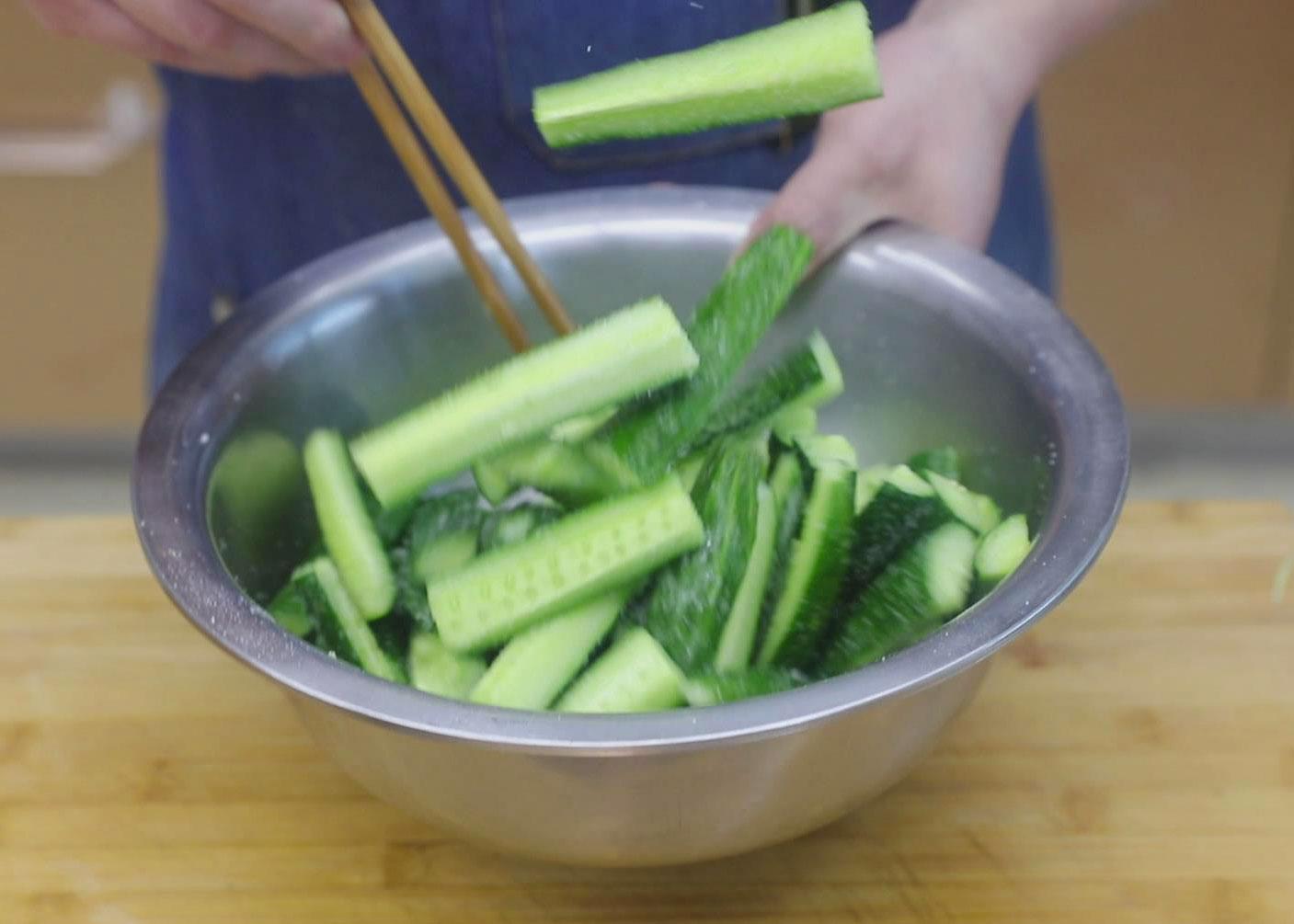 3.差不多20分钟以后 ,黄瓜条也腌好了,使劲摁压一下, 把里面的黄瓜汁挤出来,