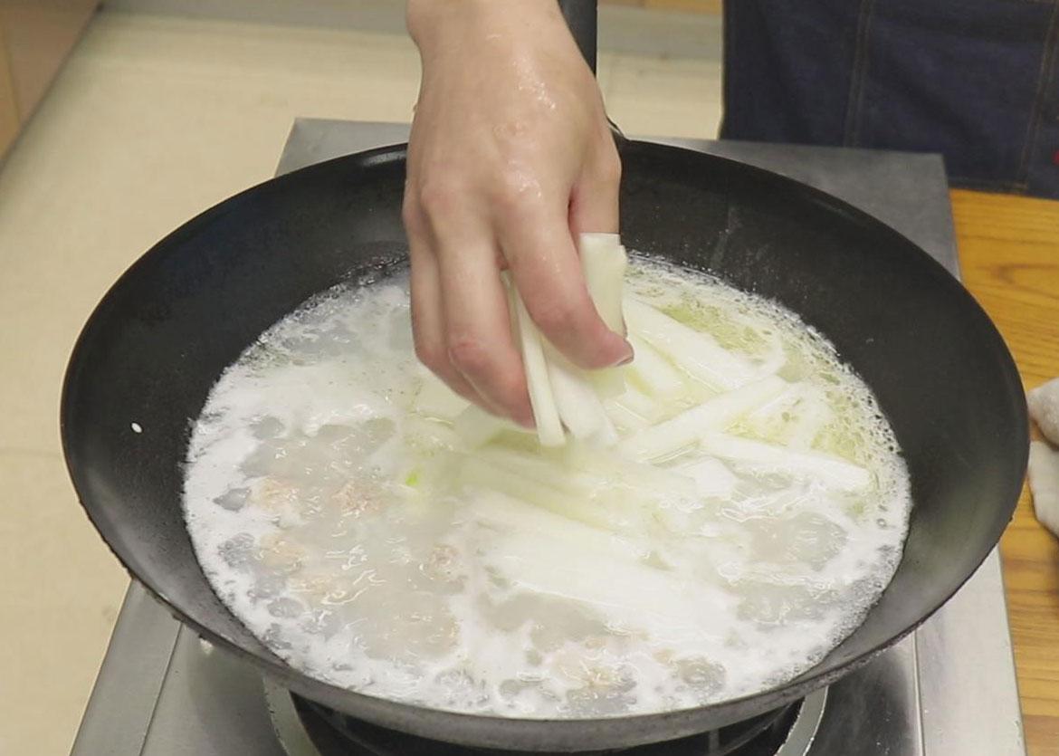 下丸子的时候 ,水不要过于沸腾, 以免把丸子冲散。丸子下完以后开中火煮至定型,放入冬瓜条煮2分钟,把丸子煮熟, 让冬瓜的清香融入到汤里面。