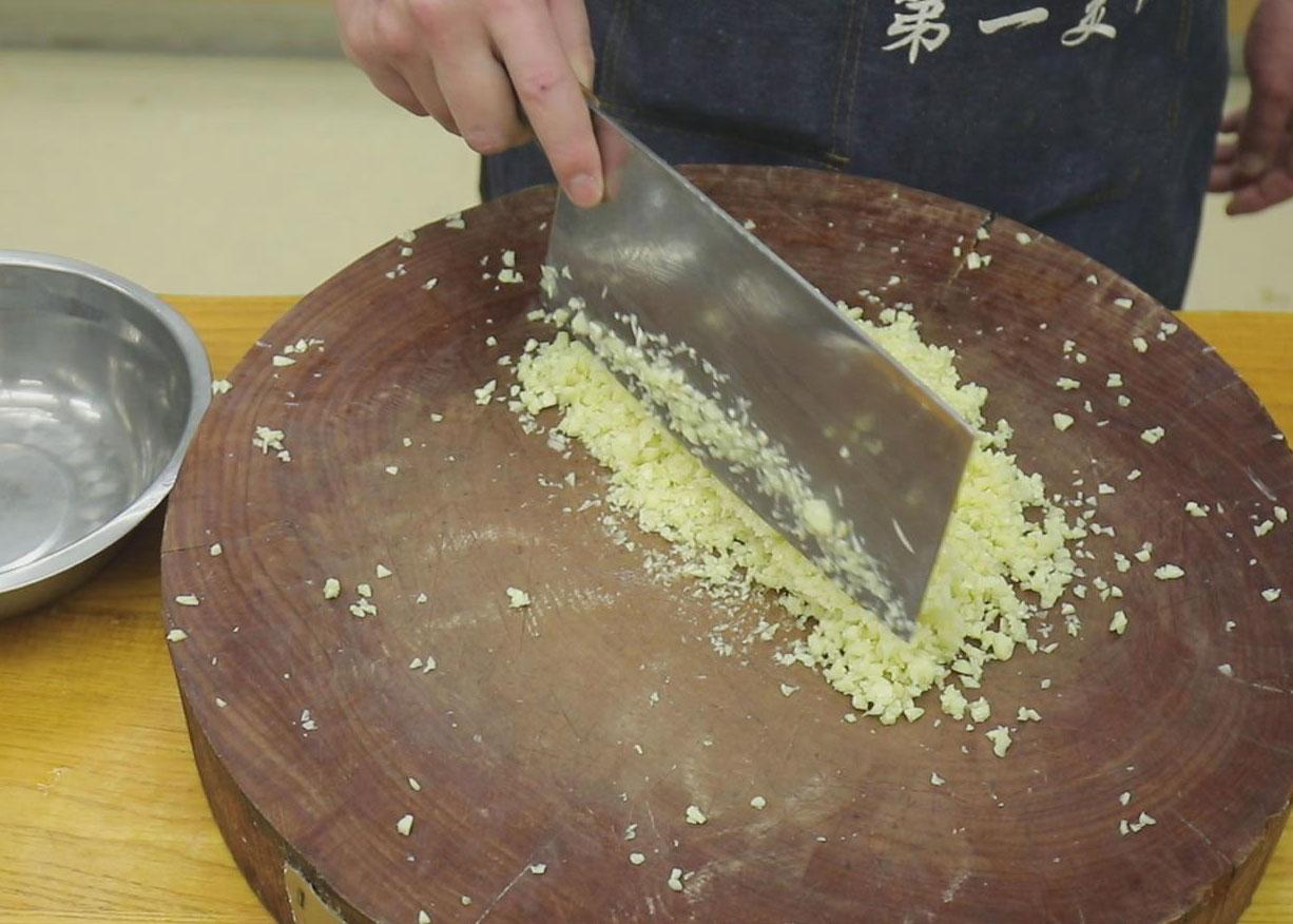 2.蒜咱得多准备点,一点一点的剁成这种米粒状,剁好以后把上面的黏液冲掉,把蒜放进锅里,开小火慢慢炸香,炒的没有生蒜味。加点鸡粉、 一点胡椒 、蚝油 、生抽调味。