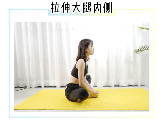 收尾动作相对轻松,身体坐起,双手握住脚背,双脚尽量靠近大腿内侧,背部伸直缓慢向下压,感受大腿内侧的拉伸感,保持30秒,重复做两组。