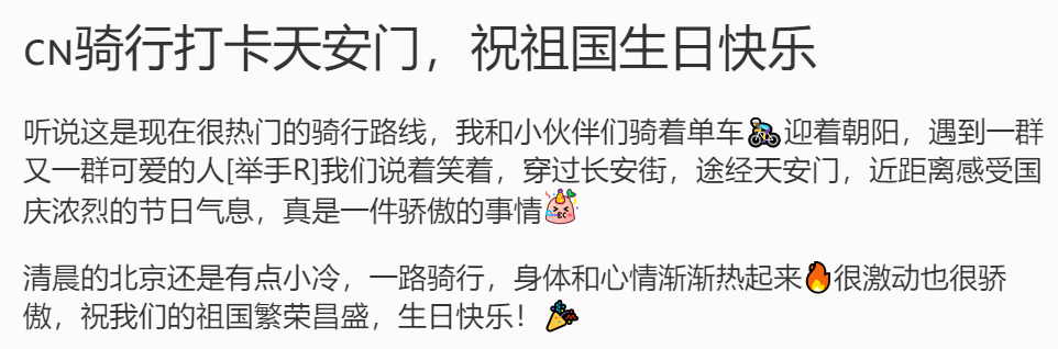 国庆节第一天,知名歌手孙悦就在社交平台上晒出了自己大早上骑行庆祝的照片和视频。