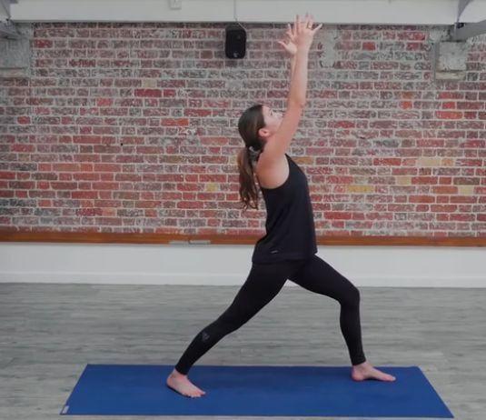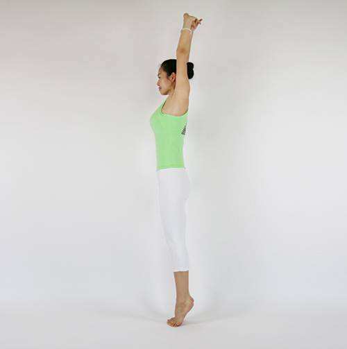 挺胸抬头,目视前方,垂直站立在瑜伽垫上。深吸一口气,将双手慢慢向上抬,举过头顶,在头顶的正上方,食指相扣并翻转掌心向上,轻轻掂起脚后跟。呼气,慢慢沉肩,保持六个呼吸。在完成这个动作的时候,一定要将脚后跟抬的尽量高一些,这样才可以对小腿产生充足的刺激。在动作还原的时候,大脚趾和小脚趾要均匀用力,避免出现受伤现象。