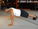 动作要领:双手掌心朝下支撑在地面上,躯干呈直线,脚尖撑地,肘部弯曲身体下放,胸大肌和三头用力将身体顶起。