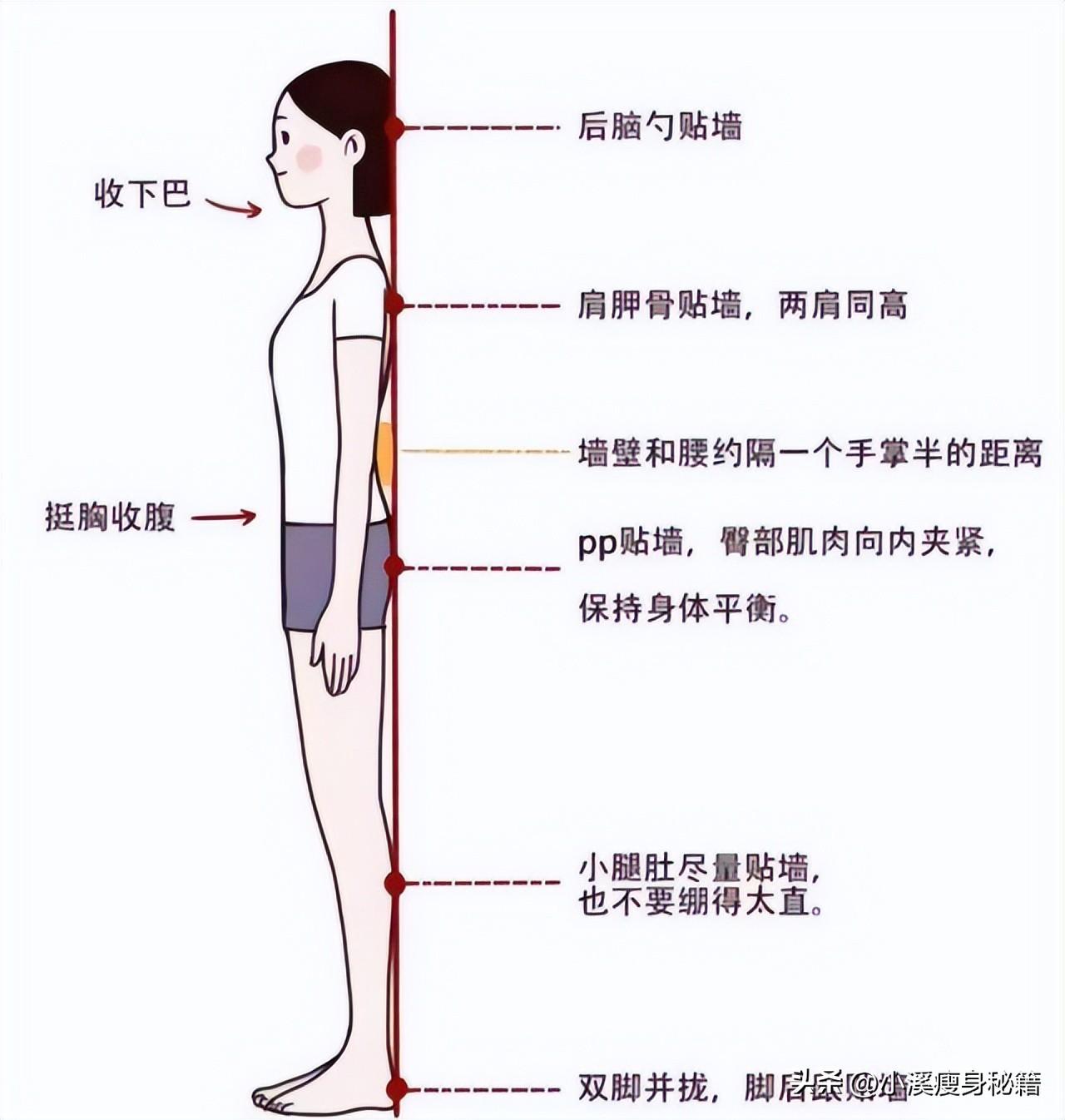 每天中午吃完饭或者晚上吃完饭,找到一面墙壁,背对墙壁,收紧小腹,用尽全力去贴紧墙壁,从脚后跟、小腿、大腿、屁股、腰、背、肩膀、后脑勺通通贴紧。保持均匀呼吸,不要憋气,裙身用劲贴墙壁即可。