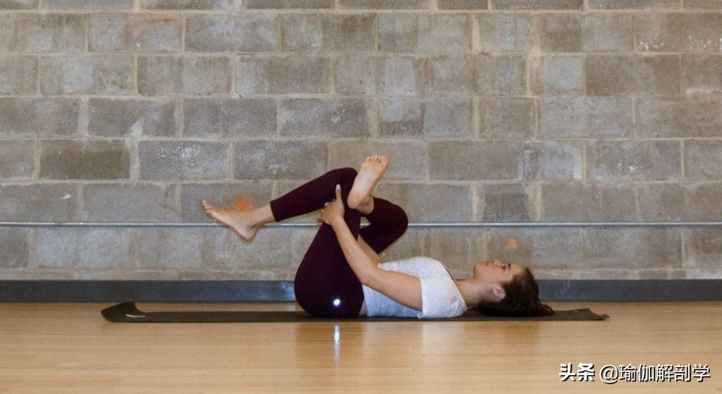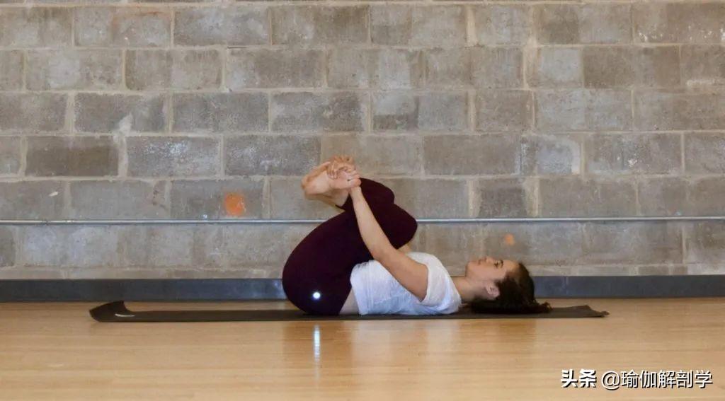仰卧,屈双膝靠近腹部右腿在上,双腿相互缠绕左手握右脚,右手握左脚将双腿尽量靠近腹部保持1-2分钟,交换动作10: