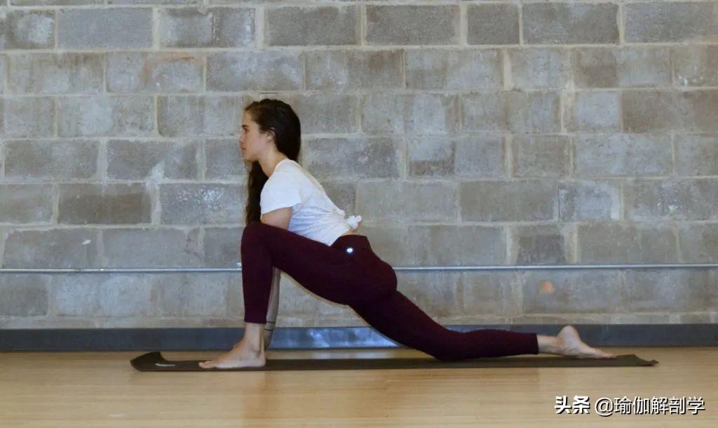 在下犬式的基础上将左脚向前迈开一大步左脚落在右手的外侧左小腿脚背贴地吸气,延展脊柱,呼气,沉髋向下保持1-2分钟